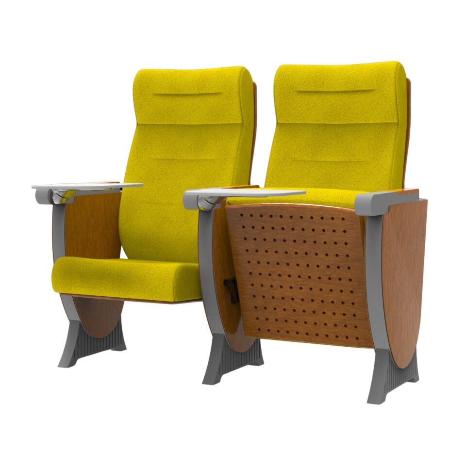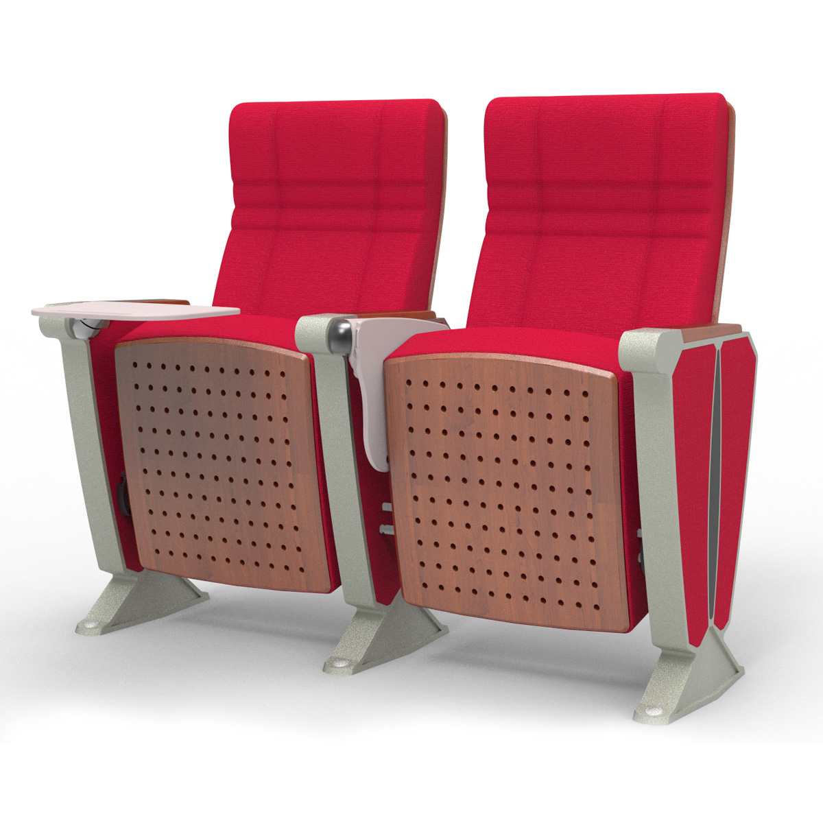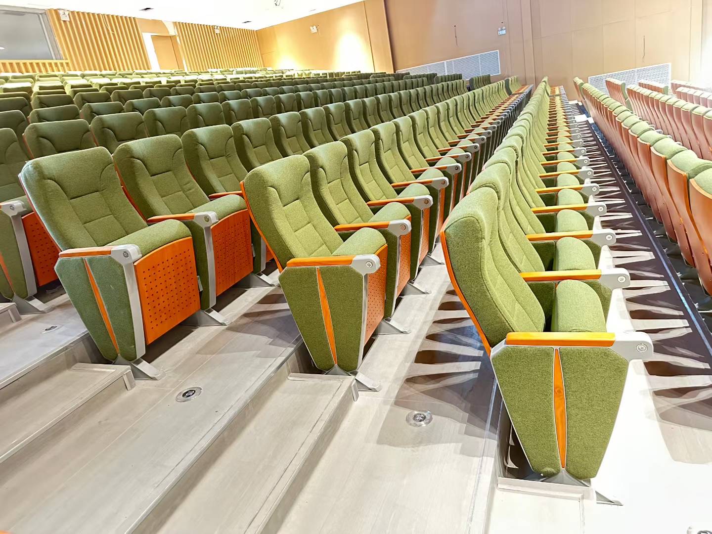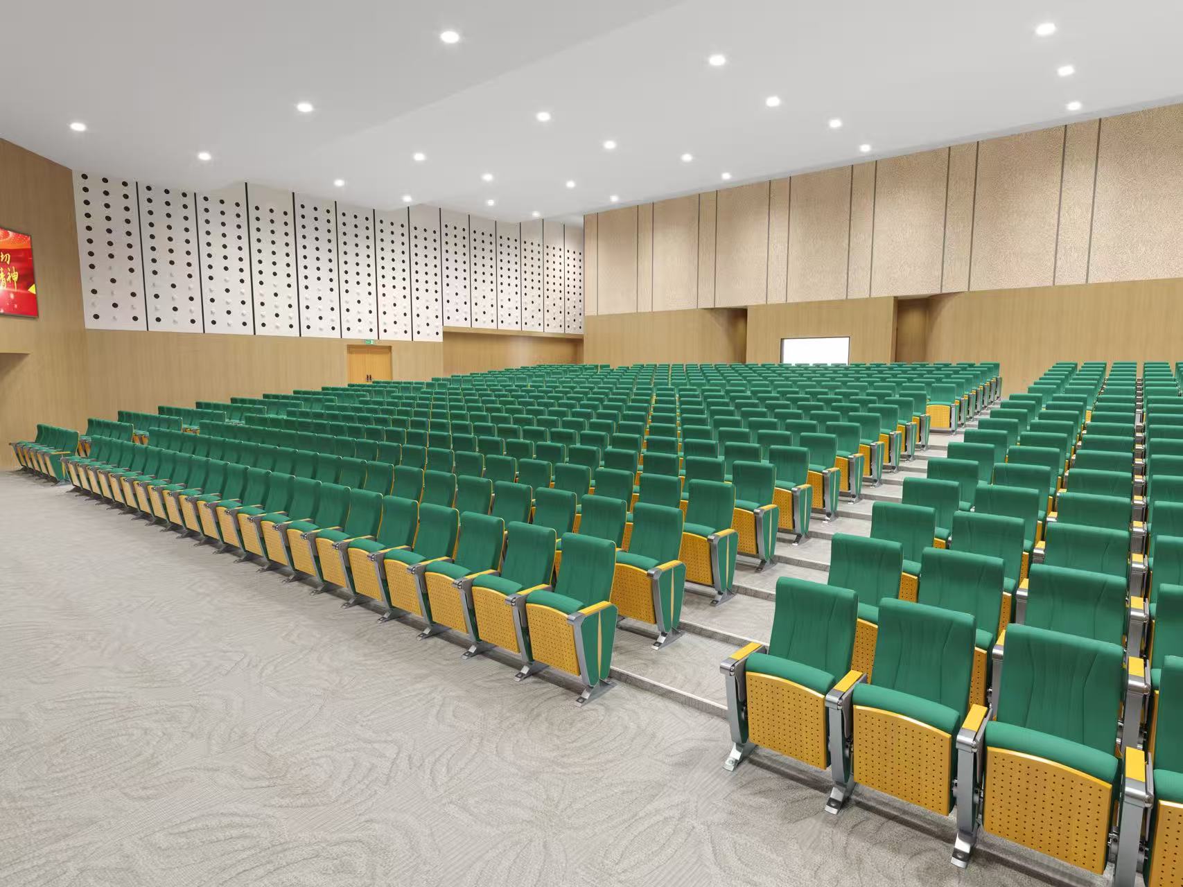 | 7. Tấm ốp ngoài có lỗ tiêu âm | Dùng ván ép gỗ cứng nhiều lớp, dày 15mm, phủ veneer, ép định hình bằng sóng cao tần và áp suất cao. Tích hợp các lỗ thoáng âm dạng tổ ong, có hệ số tiêu âm 0.5, giúp loại bỏ tiếng vọng trong vòng 0.1 giây, đảm bảo âm thanh hội trường trong và không có tiếng ồn. Màu sơn tùy chọn. | ![]() |