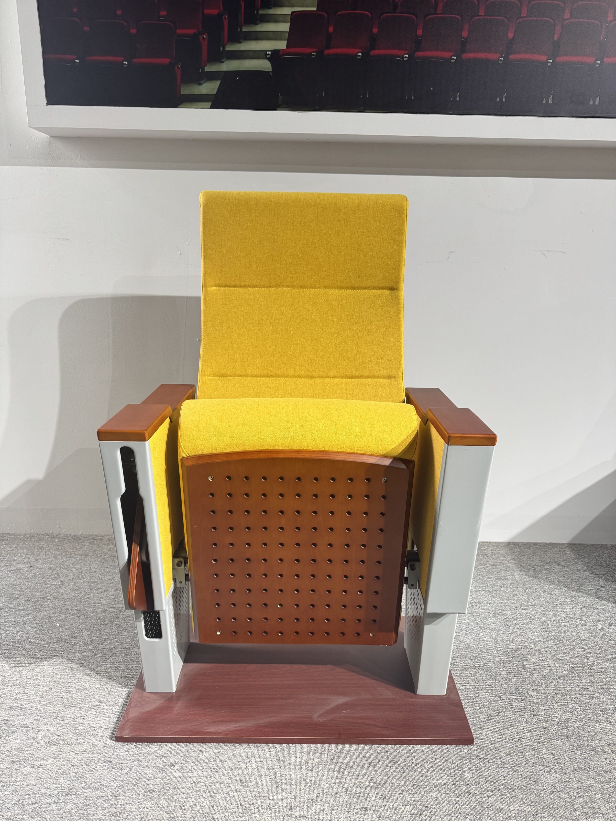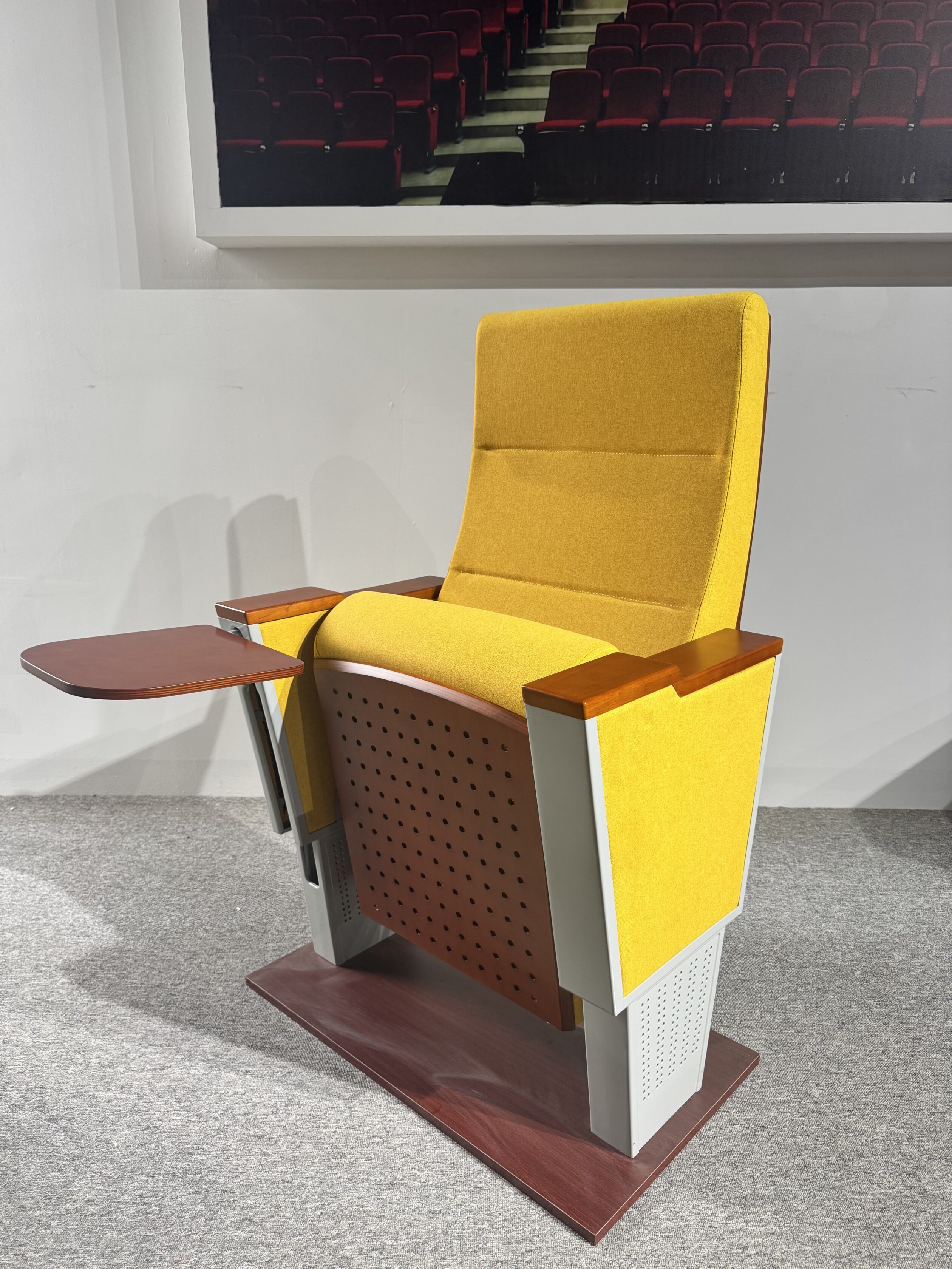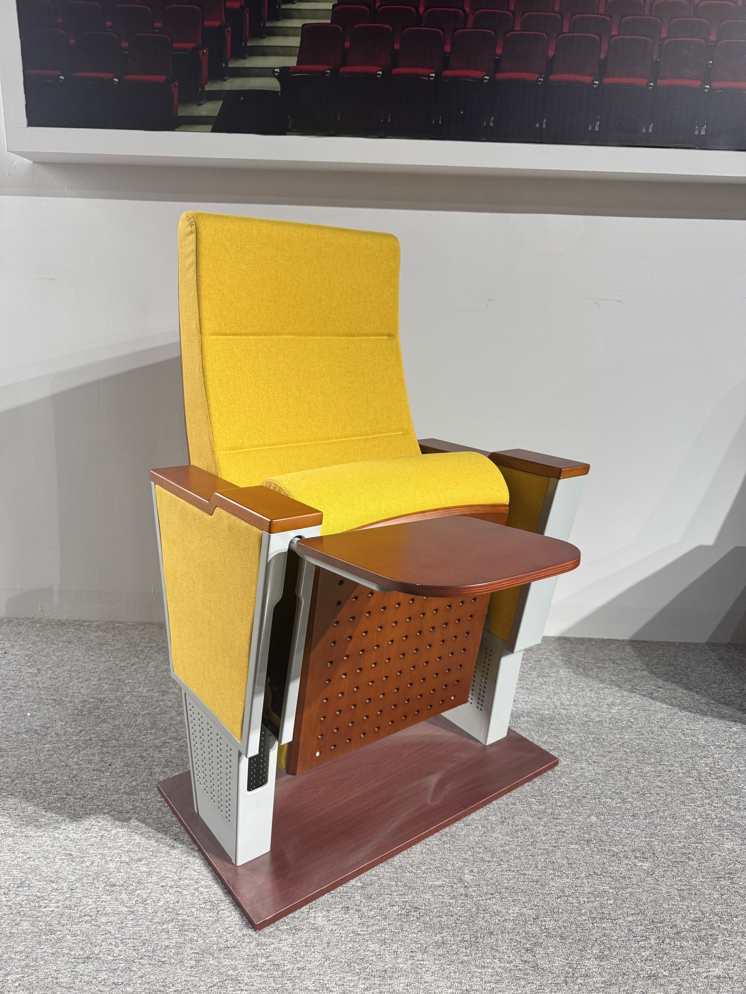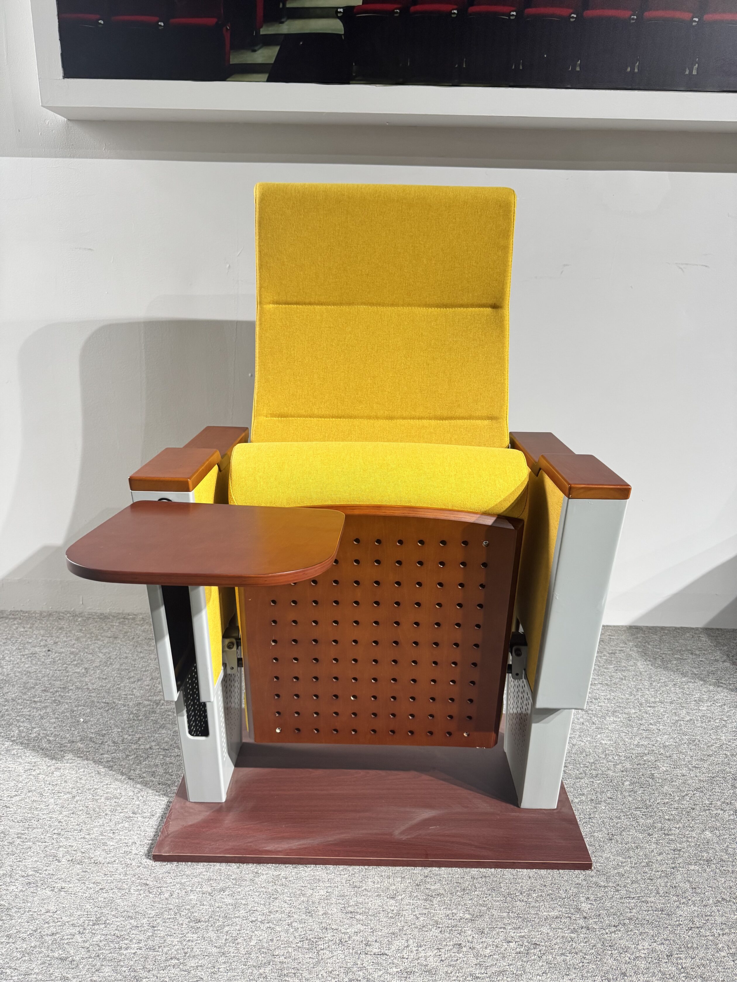 Ghế hội trường cao cấp với đệm PU đúc lạnh mật độ cao, khung thép chắc chắn, chân nhôm nguyên khối sơn tĩnh điện bền bỉ. Tay vịn gỗ nhập khẩu, bàn viết gập gọn êm ái, thiết kế tăng cường chống va đập, giảm rung hiệu quả. Chất liệu cao cấp, bền đẹp, cách âm – thoáng khí – chống tĩnh điện, phù hợp cho không gian hội nghị hiện đại.